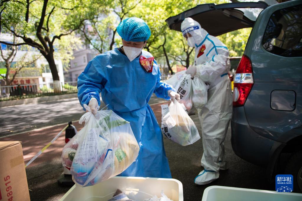 4月7日,在長沙市雨花區(qū)東塘街道楓樹山社區(qū),志愿者在卸載生活物資。新華社記者 陳思汗 攝