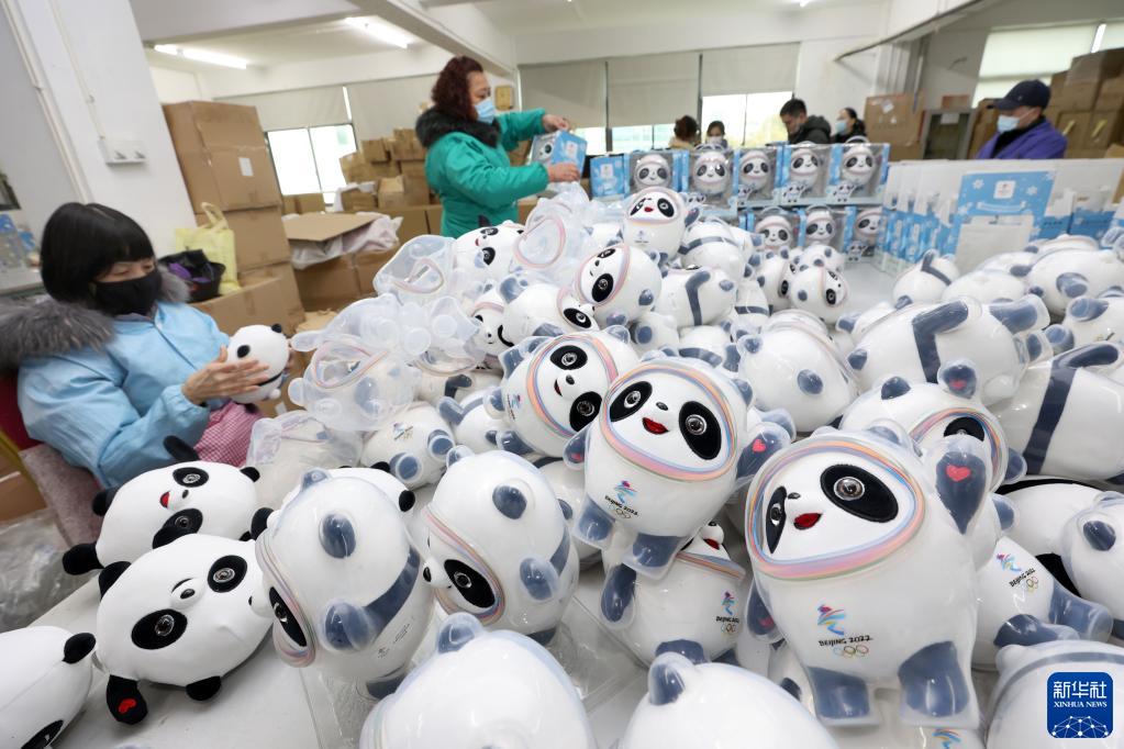 2月8日,工人在位于江蘇省啟東市的一家特許生產(chǎn)商的車(chē)間里包裝“冰墩墩”。新華社發(fā)(許叢軍 攝)