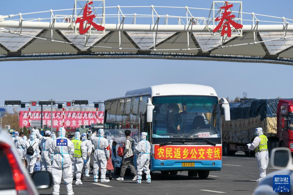 在吉林長(zhǎng)春高速公路東出口,返鄉(xiāng)農(nóng)民登上返鄉(xiāng)公交專(zhuān)線(4月12日攝)。新華社發(fā)