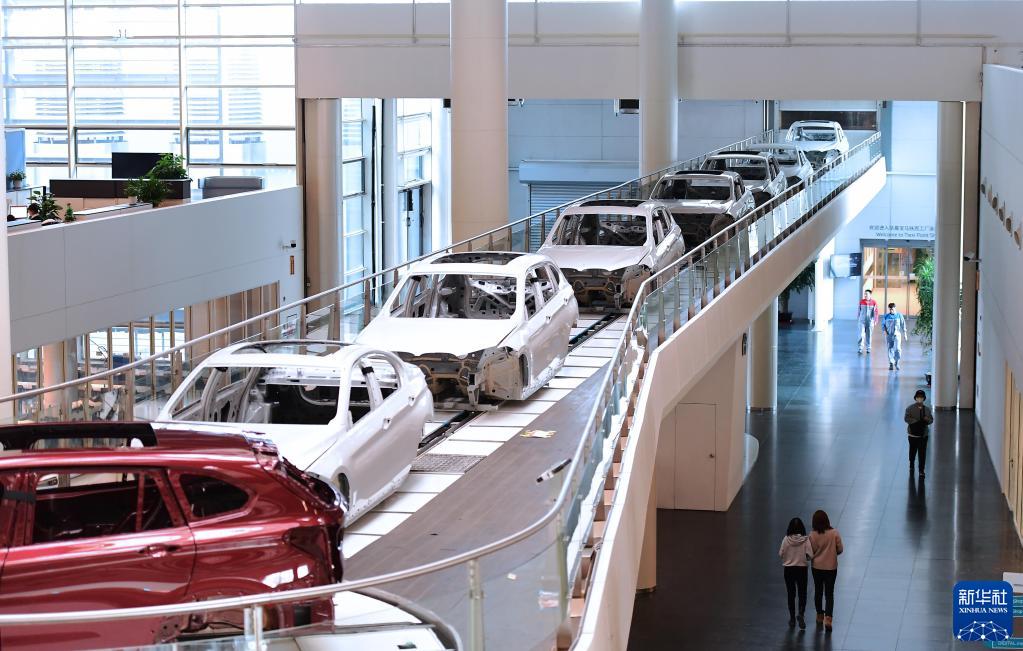 2月16日,在華晨寶馬沈陽(yáng)鐵西工廠,生產(chǎn)中的車(chē)輛穿過(guò)辦公區(qū)。新華社記者 楊青 攝