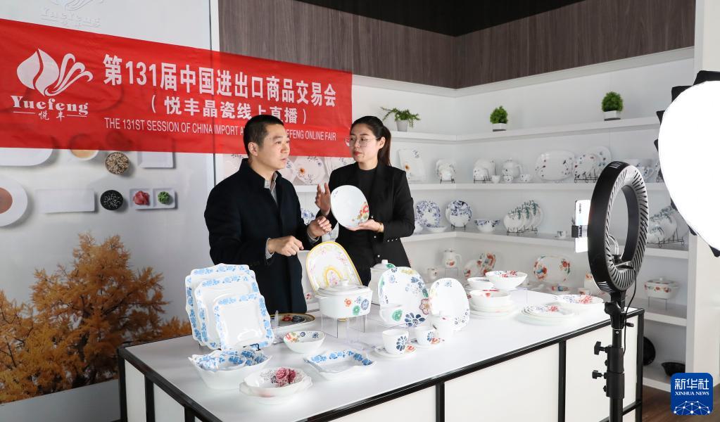 4月15日,第131屆中國(guó)進(jìn)出口商品交易會(huì)線上開(kāi)幕。在江蘇省淮安市洪澤區(qū),一家陶瓷企業(yè)的工作人員在展廳直播介紹產(chǎn)品。新華社發(fā)(趙啟瑞 攝)