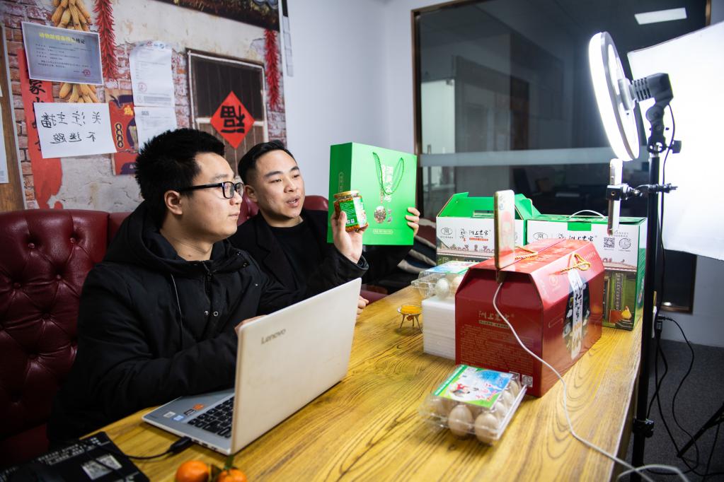 2022年2月22日,蔣連超(右)在湖南益陽市沅江高新技術(shù)產(chǎn)業(yè)園區(qū)與搭檔一起直播帶貨。新華社記者 陳思汗 攝