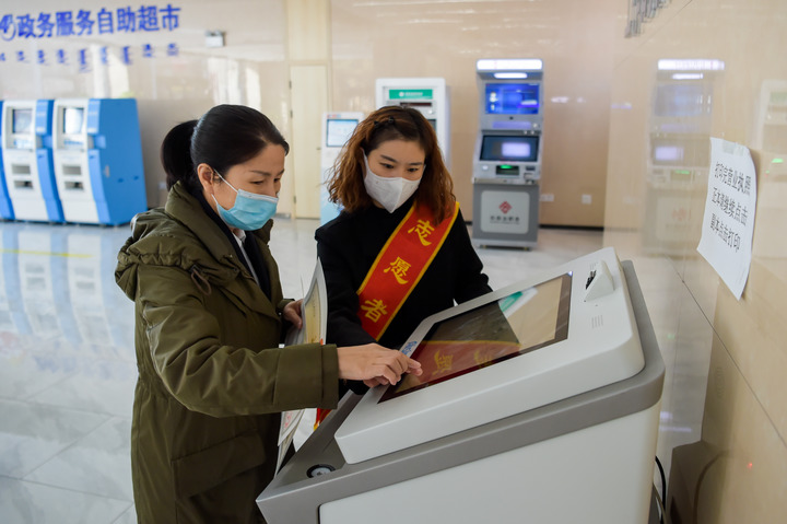 4月2日,在位于呼和浩特市玉泉區(qū)政務(wù)服務(wù)中心的“24小時政務(wù)服務(wù)自助超市”,一位市民在工作人員指導(dǎo)下打印營業(yè)執(zhí)照。新華社記者李志鵬 攝