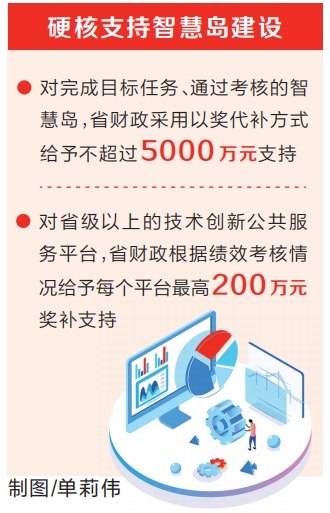如何支持智慧島建設?我省將給出“真金白銀”硬投入。對完成目標任務、通過考核的智慧島,省財政結合其任務完成情況,采用以獎代補方式給予不超過5000萬元支持,主要用于支持智慧島研發(fā)設計、成果轉化、檢驗檢測等公共服務平臺建設和高層次人才引進;對省級以上的技術創(chuàng)新公共服務平臺,省財政根據(jù)績效考核情況給予每個平臺最高200萬元獎補支持;入駐智慧島的科研機構、企業(yè)建設的重點實驗室、技術創(chuàng)新中心、企業(yè)技術中心、工程研究中心等創(chuàng)新平臺被新認定為國家級創(chuàng)新平臺的,省財政給予每個平臺500萬元一次性獎勵。