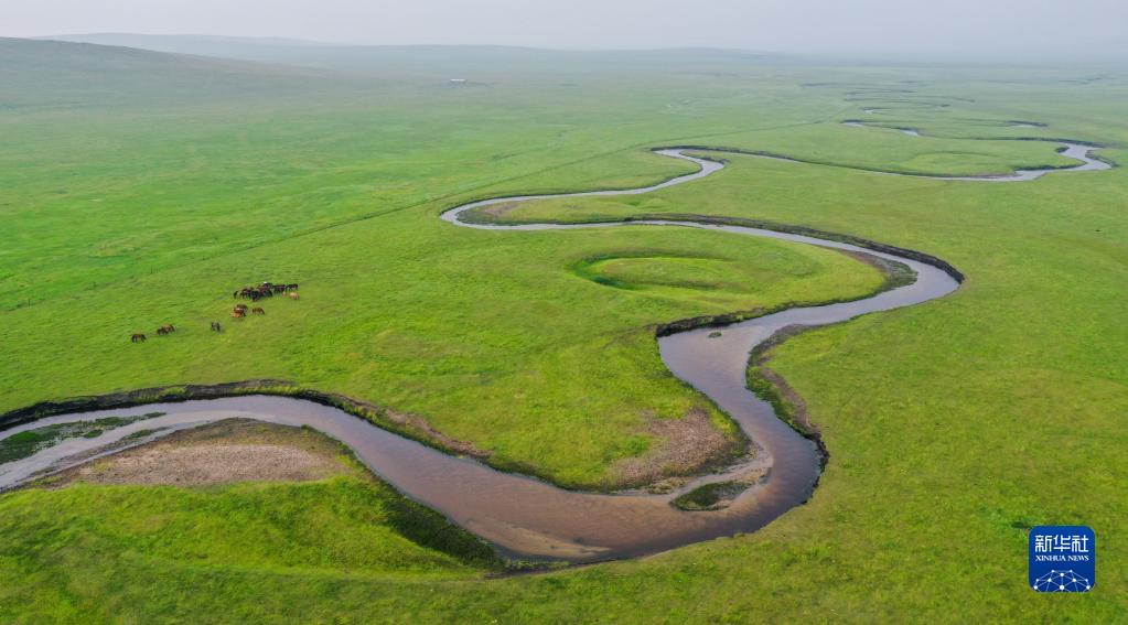 這是內(nèi)蒙古錫林郭勒盟東烏珠穆沁旗乃林高勒的草原風(fēng)光(2021年7月12日攝,無(wú)人機(jī)照片)。新華社記者 連振 攝