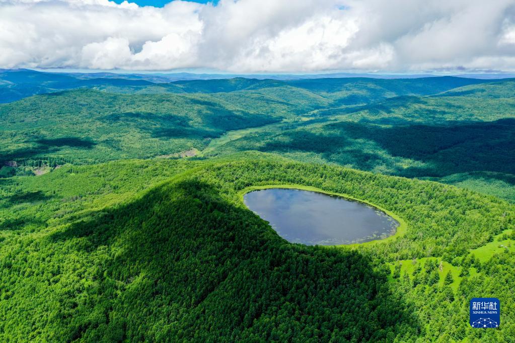這是內(nèi)蒙古阿爾山天池風(fēng)光(2021年7月14日攝,無(wú)人機(jī)照片)。新華社記者 連振 攝