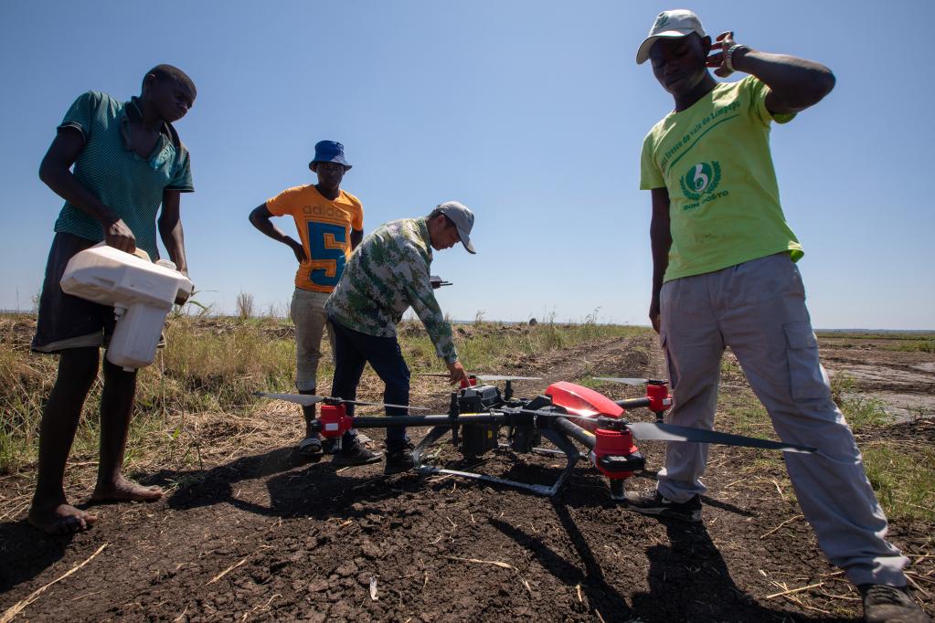 2019年11月28日,在莫桑比克的萬(wàn)寶莫桑農(nóng)業(yè)園,中國(guó)農(nóng)業(yè)專家(右二)指導(dǎo)當(dāng)?shù)毓と耸褂脽o(wú)人機(jī)噴灑除草劑。新華社記者 張宇 攝
