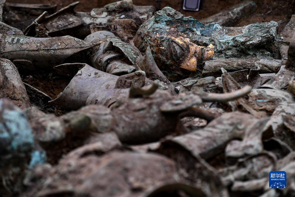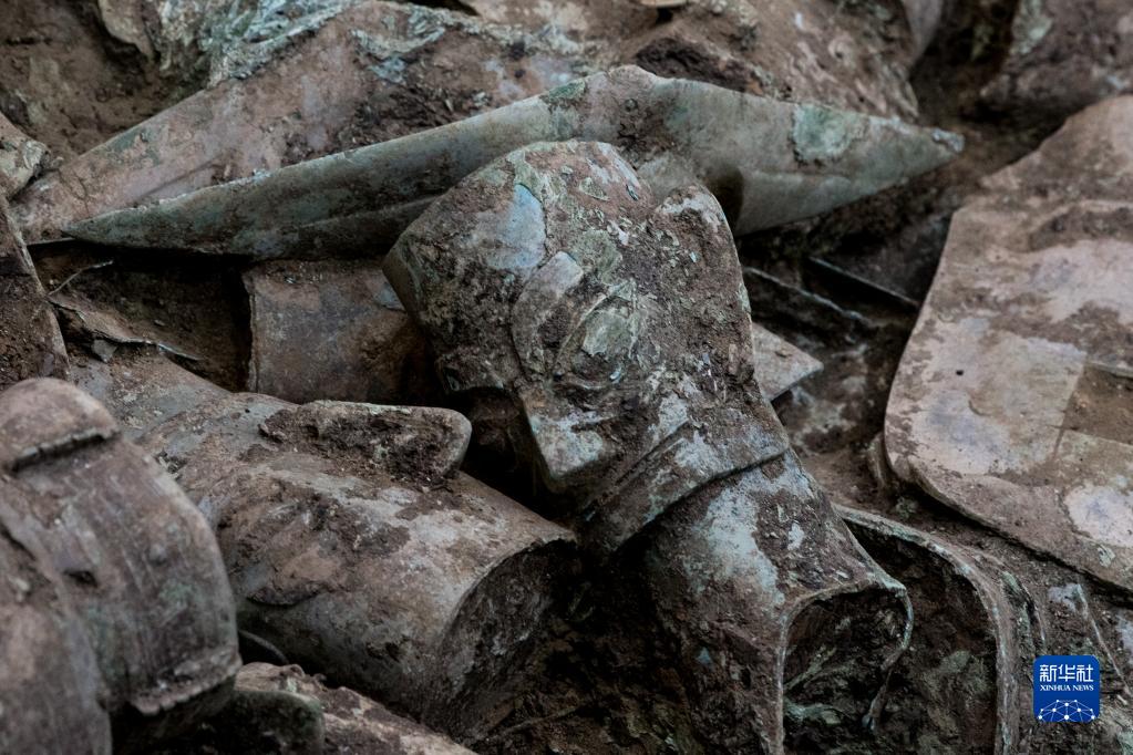 這是在三星堆遺址8號“祭祀坑”拍攝的銅人像(6月1日攝)。新華社記者 王曦 攝