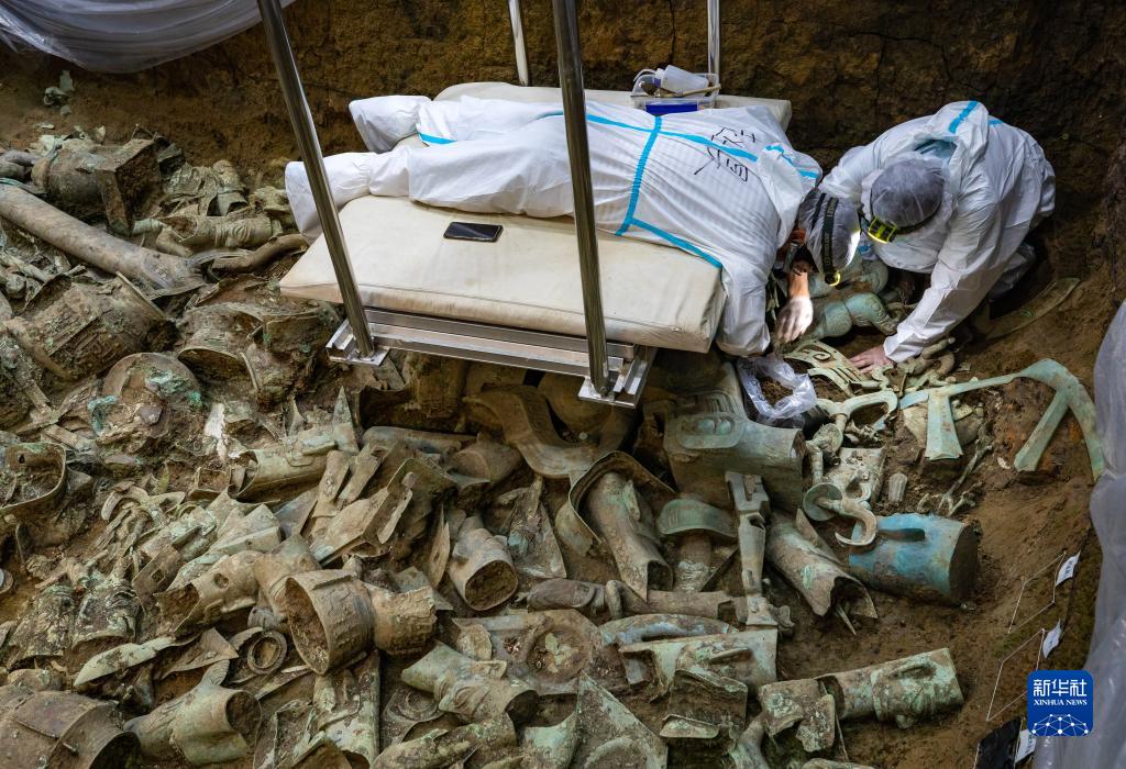 在三星堆遺址8號“祭祀坑”,8號“祭祀坑”發(fā)掘負責人、北京大學考古文博學院副教授趙昊(左)與考古工作者任俊鋒一起清理銅神壇(6月1日攝)。新華社記者 沈伯韓 攝