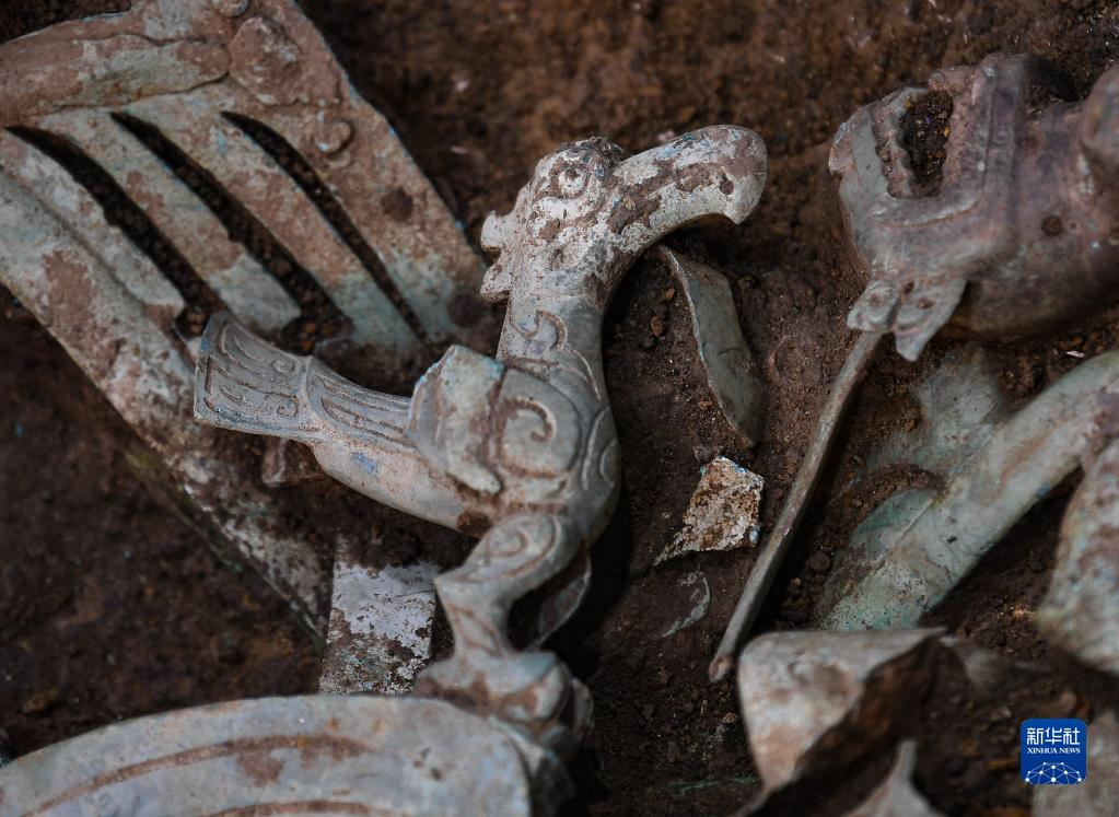 這是在三星堆遺址8號“祭祀坑”拍攝的銅神鳥(6月1日攝)。新華社記者 王曦 攝