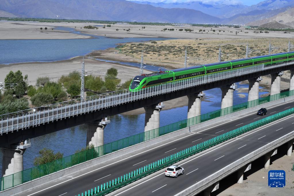 試運行的復(fù)興號列車行駛在雅魯藏布江畔(2021年6月16日攝)。新華社記者 覺果 攝