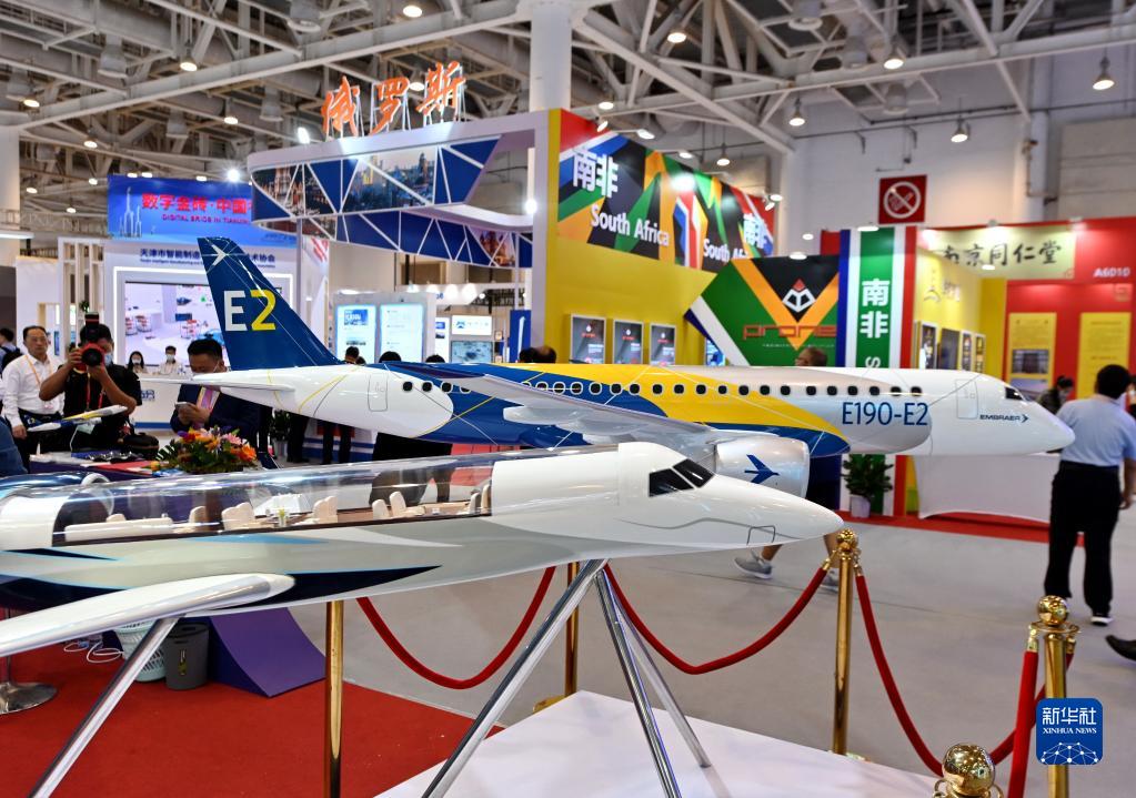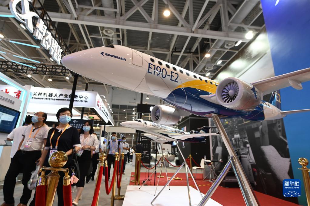 參觀者從2021金磚國家新工業(yè)革命展展出的飛機模型前走過(2021年9月8日攝)。新華社記者 林善傳 攝