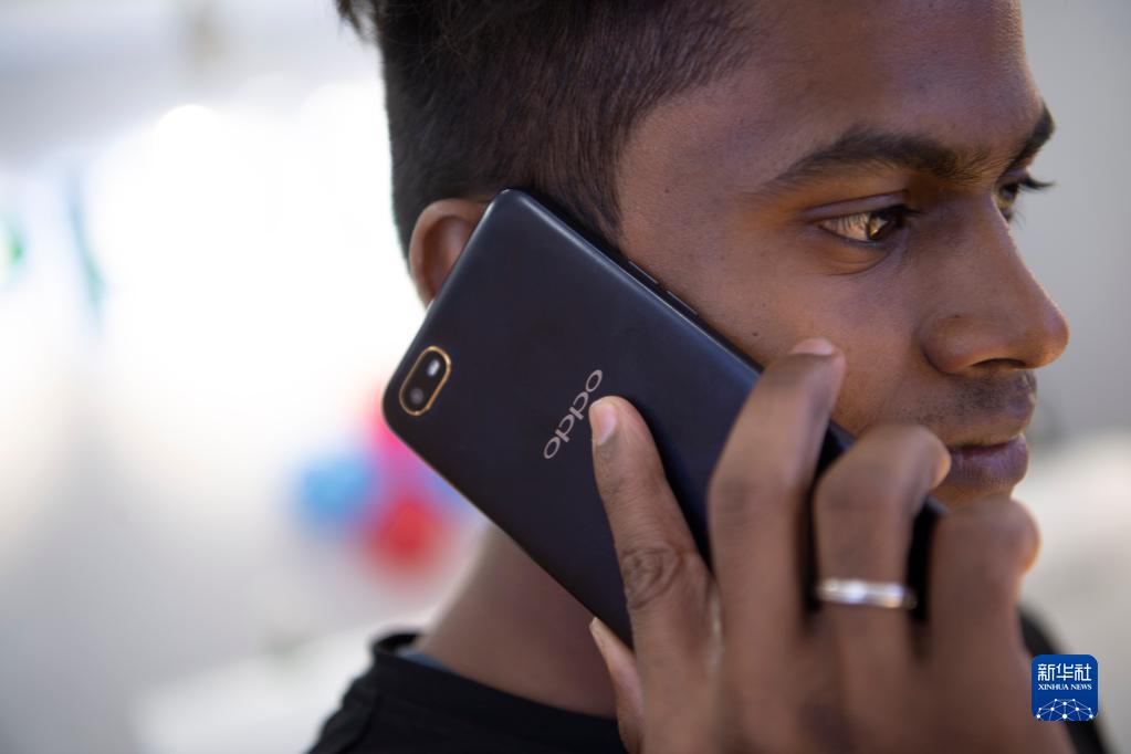 2019年10月8日,一名男子在印度金奈的一家商場使用中國品牌的手機。新華社記者 呂小煒 攝