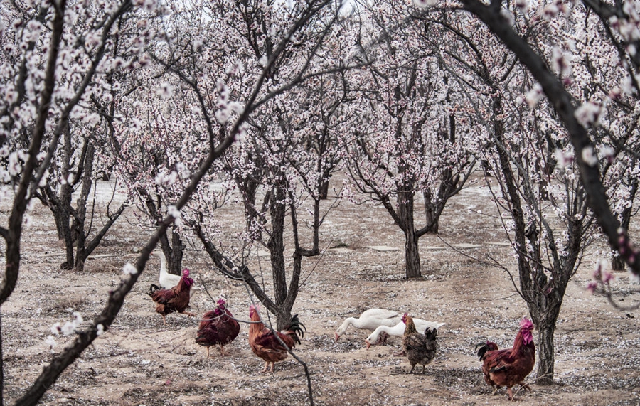 ↑一群雞鵝在陜西省榆林市榆陽(yáng)區(qū)古塔鎮(zhèn)趙家茆村的杏樹林里覓食(2020年4月7日攝)。當(dāng)?shù)厝罕娫诎l(fā)展杏產(chǎn)業(yè)的同時(shí)發(fā)展林下經(jīng)濟(jì),成效顯著。