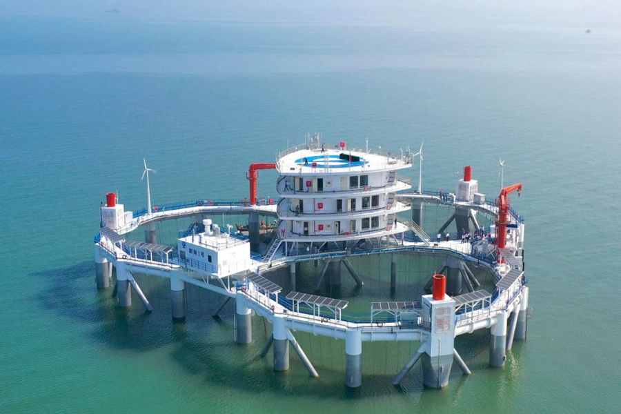 ↑“耕海1號(hào)”海洋牧場(chǎng)綜合體平臺(tái)位于山東省煙臺(tái)市漁人碼頭以東海域,是我國(guó)首座大型智能化海洋牧場(chǎng)綜合體平臺(tái),于2020年7月投運(yùn),每年可養(yǎng)殖優(yōu)質(zhì)海水魚類20萬(wàn)尾,年產(chǎn)量約15萬(wàn)公斤(2020年7月10日攝)。
