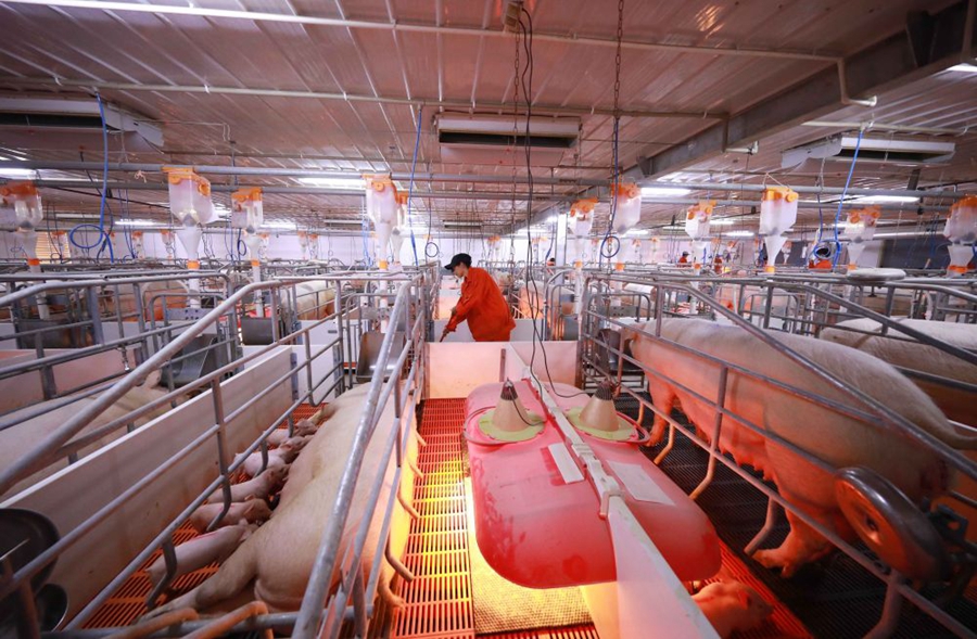 ↑在貴州省銅仁市玉屏侗族自治縣朱家場(chǎng)鎮(zhèn)一家仔豬繁殖場(chǎng),管理員在清掃豬舍(2018年3月23日攝)。