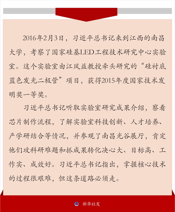 習近平總書記聽取實驗室研究成果介紹,察看芯片制作流程,了解實驗室科技創(chuàng)新、人才培養(yǎng)、產(chǎn)學研結合等情況,并參觀了南昌光谷展廳,肯定他們攻科研難題和抓成果轉化決心大、目標高、工作實、成效好。習近平總書記指出,掌握核心技術的過程很艱難,但這條道路必須走。