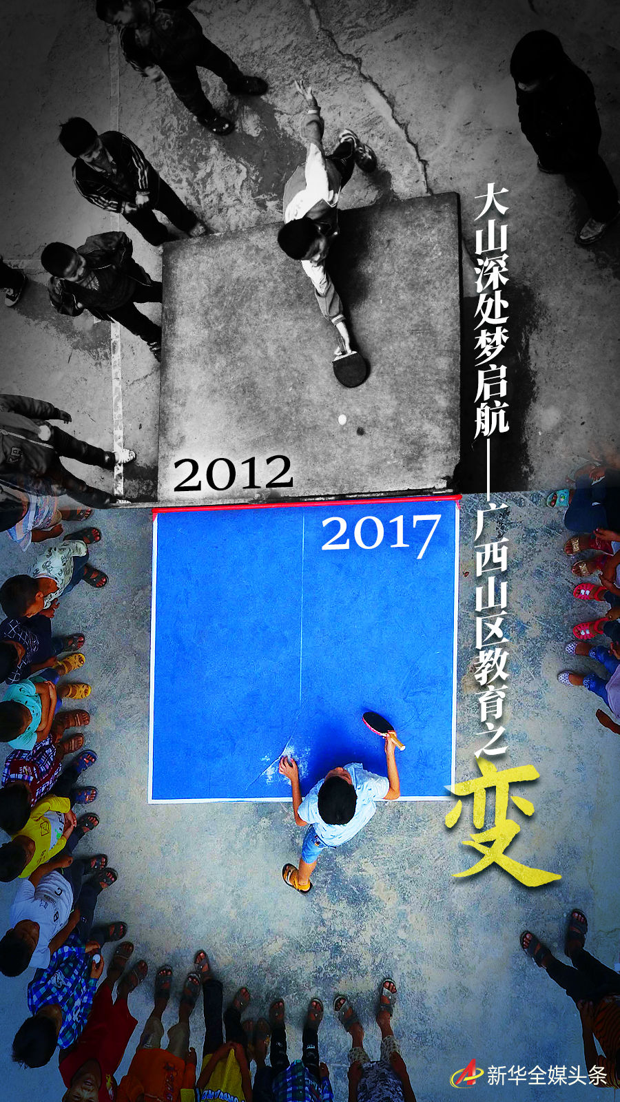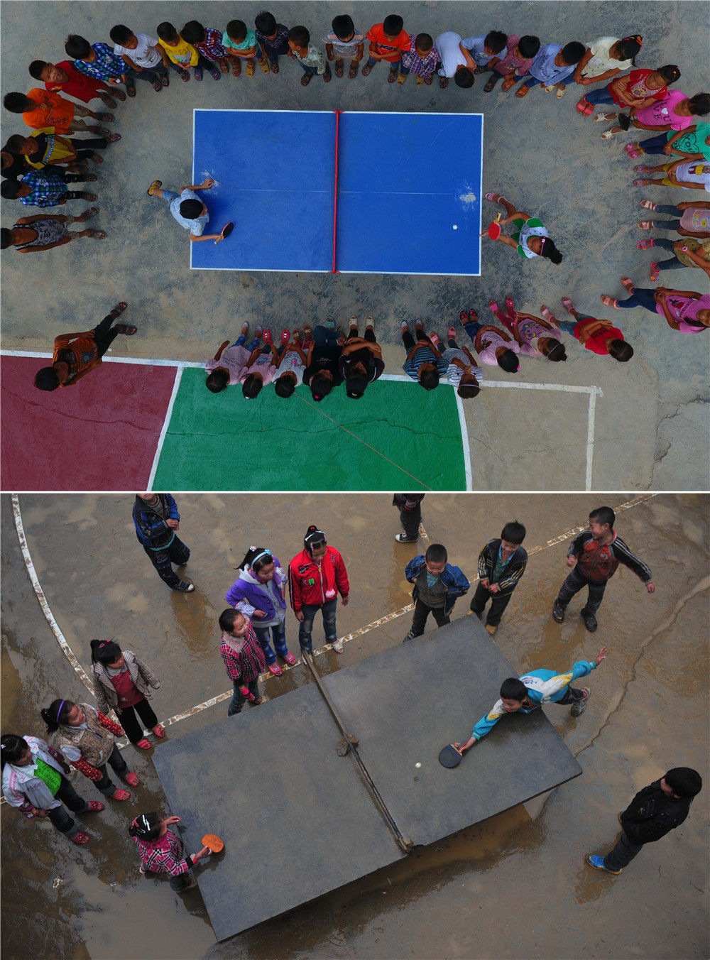 拼版照片:上圖為在廣西大化瑤族自治縣板升鄉(xiāng)弄勇小學(xué),孩子們?cè)诖蚱古仪颍?/span>2017年9月4日攝,無人機(jī)照片);下圖為在弄勇小學(xué),孩子們?cè)诖蚱古仪颍?/span>2012年12月26日攝)。新華社記者 黃孝邦 攝
