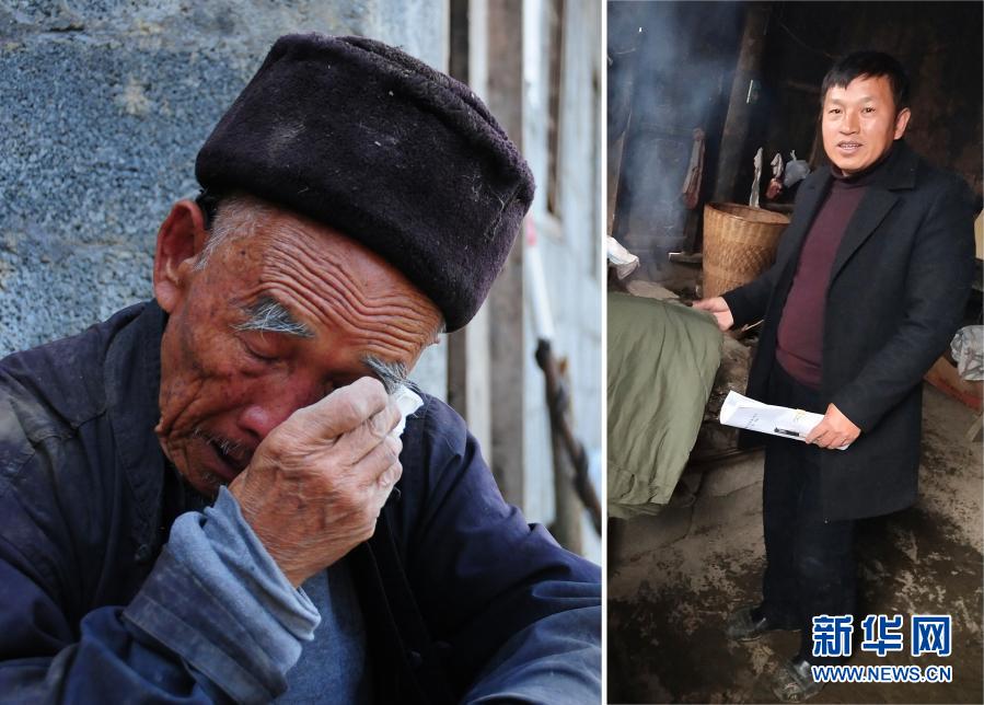拼版照片:左圖為2019年10月1日,貴州省銅仁市沿河土家族自治縣中寨鎮(zhèn)大坪村村民張信龍談起文偉紅時傷心落淚(新華社記者胡星攝);右圖為2018年12月27日,文偉紅在沿河土家族自治縣中寨鎮(zhèn)大坪村村民家中走訪。新華社發(fā)