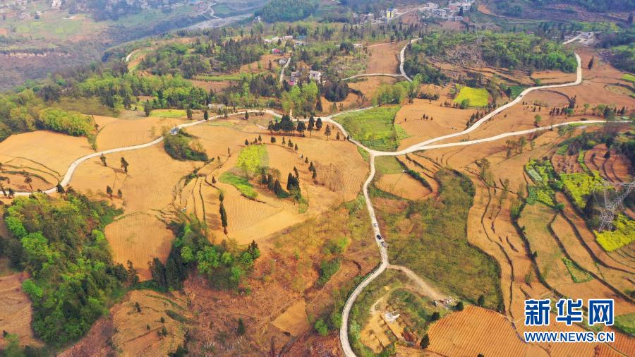 貴州省六枝特區(qū)大箐村的產(chǎn)業(yè)路四通八達,這里是倪裔豹駐村的“最后一崗”(2020年3月24日攝,無人機照片)。新華社記者 劉勤兵 攝