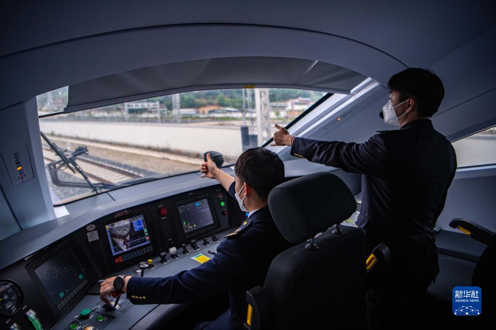 列車司機(jī)駕駛復(fù)興號列車行駛在中老鐵路上(2022年6月1日攝)。新華社記者 江文耀 攝