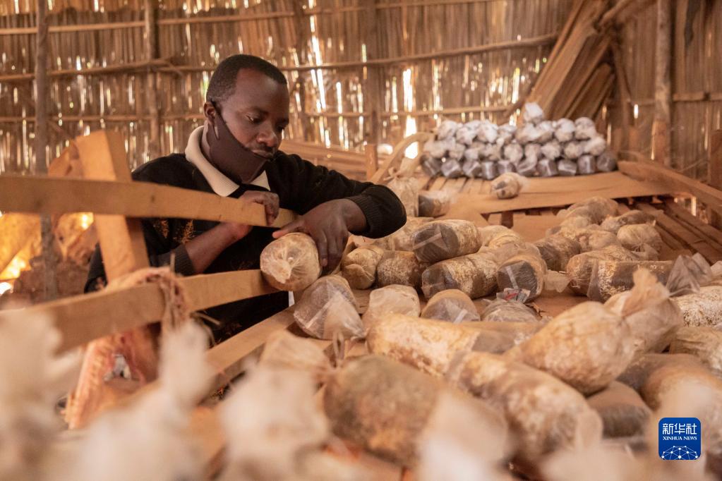在盧旺達(dá)首都基加利的一家食用菌培育作坊,作坊主人埃馬紐埃爾·阿希馬納檢查菌袋(2020年9月9日攝)。中國福建農(nóng)林大學(xué)的菌草專家2006年來到盧旺達(dá)開始菌草技術(shù)合作項(xiàng)目,在當(dāng)?shù)厥痉逗屯茝V菌草技術(shù)。新華社發(fā)(西里爾·恩德格亞攝)