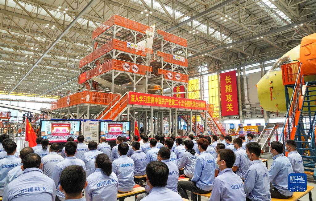 10月16日,在中國(guó)商飛上海飛機(jī)制造有限公司總裝車(chē)間,員工們?cè)谑湛粗袊?guó)共產(chǎn)黨第二十次全國(guó)代表大會(huì)開(kāi)幕會(huì)。新華社記者 丁汀 攝