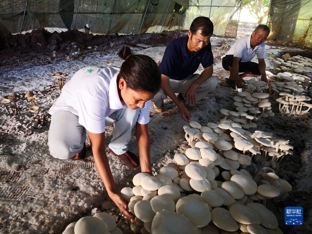 在斐濟楠迪,中國專家和當?shù)毓蛦T檢查菌菇生長情況(2018年6月12日攝)。新華社記者 張永興 攝
