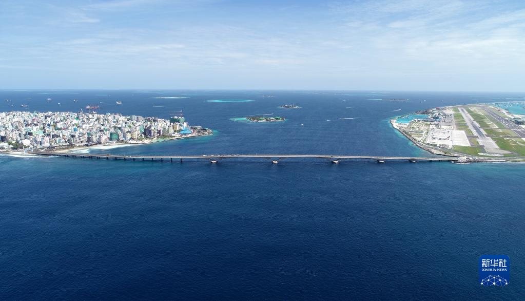 這是在馬爾代夫航拍的連接首都馬累和機場島的中馬友誼大橋(2019年8月30日攝)。新華社發(fā)(王明亮 攝)