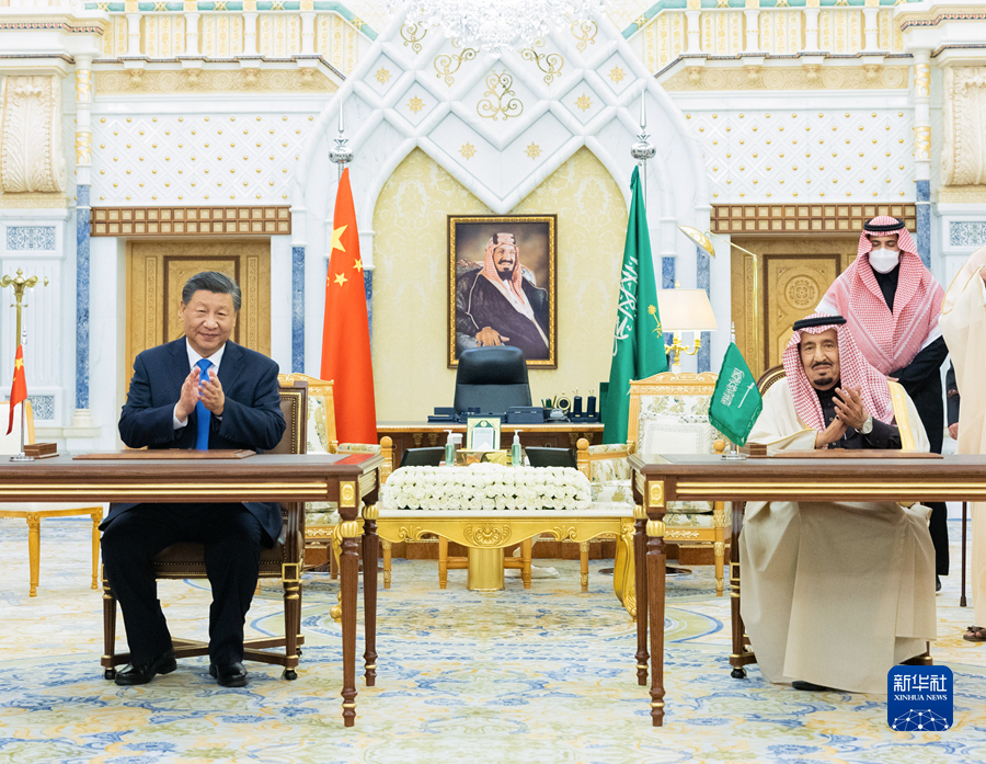 當(dāng)?shù)貢r(shí)間12月8日下午,國(guó)家主席習(xí)近平在利雅得王宮會(huì)見(jiàn)沙特國(guó)王薩勒曼。這是兩國(guó)元首親自簽署《中華人民共和國(guó)和沙特阿拉伯王國(guó)全面戰(zhàn)略伙伴關(guān)系協(xié)議》,同意每?jī)赡暝趦蓢?guó)輪流舉行一次元首會(huì)晤。新華社發(fā)