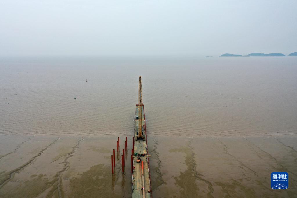 工程人員在通蘇嘉甬高鐵杭州灣跨海鐵路大橋施工現(xiàn)場鋪設(shè)棧橋,為后期工程做準(zhǔn)備(2023年2月1日攝,無人機(jī)照片)。2022年11月30日開工建設(shè)的通蘇嘉甬高鐵杭州灣跨海鐵路大橋全程跨海,總長約29.2公里,為設(shè)計(jì)時(shí)速350公里的雙線高速鐵路橋,是目前世界上在建長度最長、建設(shè)標(biāo)準(zhǔn)最高的高速鐵路跨海大橋。新華社記者 黃宗治 攝