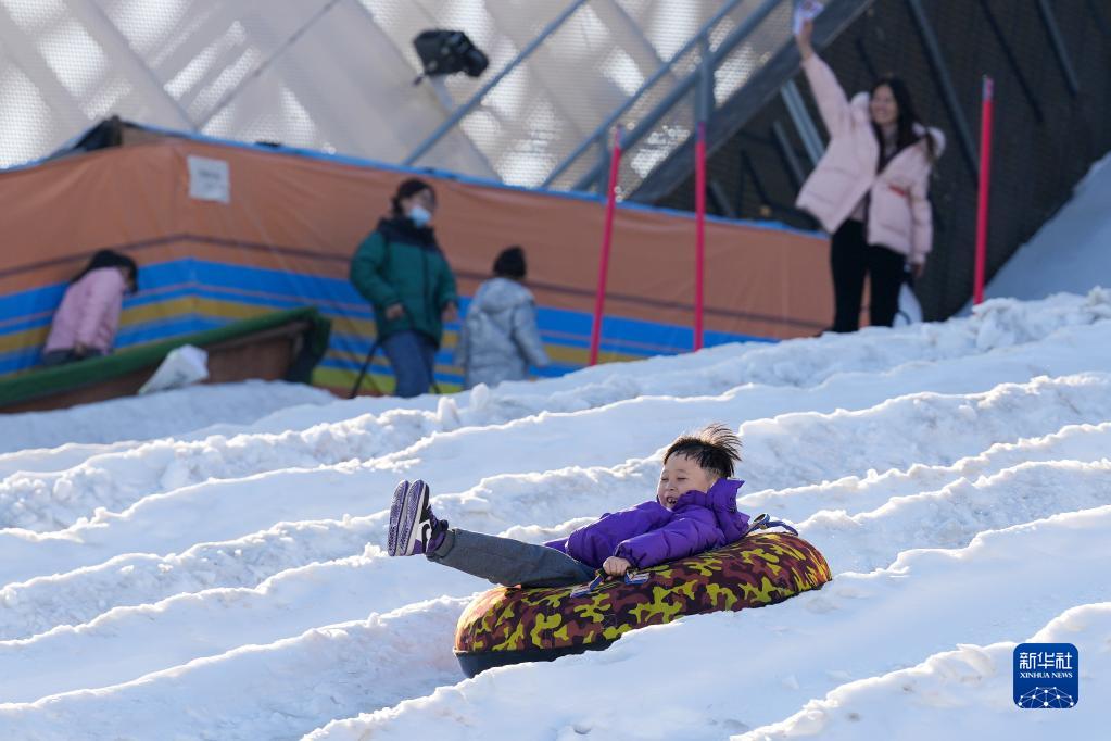 在黑龍江哈爾濱,零下十幾攝氏度的室外溫度阻擋不了人們?cè)诒獾乃苫ń贤嫜┑仫L(fēng)箏、冰球、雪地自行車、冰雪滑道等項(xiàng)目。