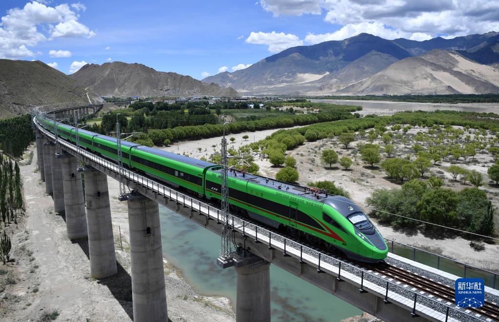 復(fù)興號列車行駛在西藏山南境內(nèi)(2022年6月22日攝)。新華社記者 覺果 攝