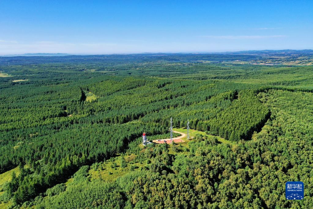 這是2021年8月23日拍攝的河北塞罕壩機械林場內(nèi)的望海樓(無人機照片)。新華社記者 牟宇 攝