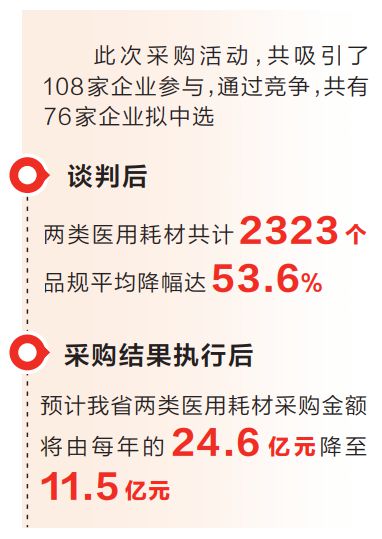 此次采購活動,共吸引了108家企業(yè)參與,其中,國內(nèi)企業(yè)70家、外資企業(yè)38家。通過前期充分調(diào)研,會中集中開標(biāo)、兩輪談判等公平競爭環(huán)節(jié),共有76家企業(yè)擬中選。談判后,兩類醫(yī)用耗材共計(jì)2323個(gè)品規(guī)平均降幅達(dá)53.6%。采購結(jié)果執(zhí)行后,預(yù)計(jì)我省兩類醫(yī)用耗材采購金額將由每年的24.6億元降至11.5億元。
