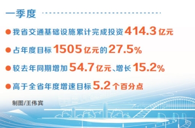 這是我省全力推動交通重點項目建設(shè)加速提質(zhì)增效的一個縮影。記者從當(dāng)天召開的河南省交通運(yùn)輸經(jīng)濟(jì)運(yùn)行調(diào)度會上獲悉,今年一季度,我省交通基礎(chǔ)設(shè)施累計完成投資414.3億元,占年度目標(biāo)1505億元的27.5%,較去年同期增加54.7億元、增長15.2%,高于全省年度增速目標(biāo)5.2個百分點。