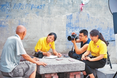 秦國(guó)防(右二)和學(xué)生們利用暑期到林州市任村鎮(zhèn)前莊,為修渠老人拍攝照片。李若瑜 攝