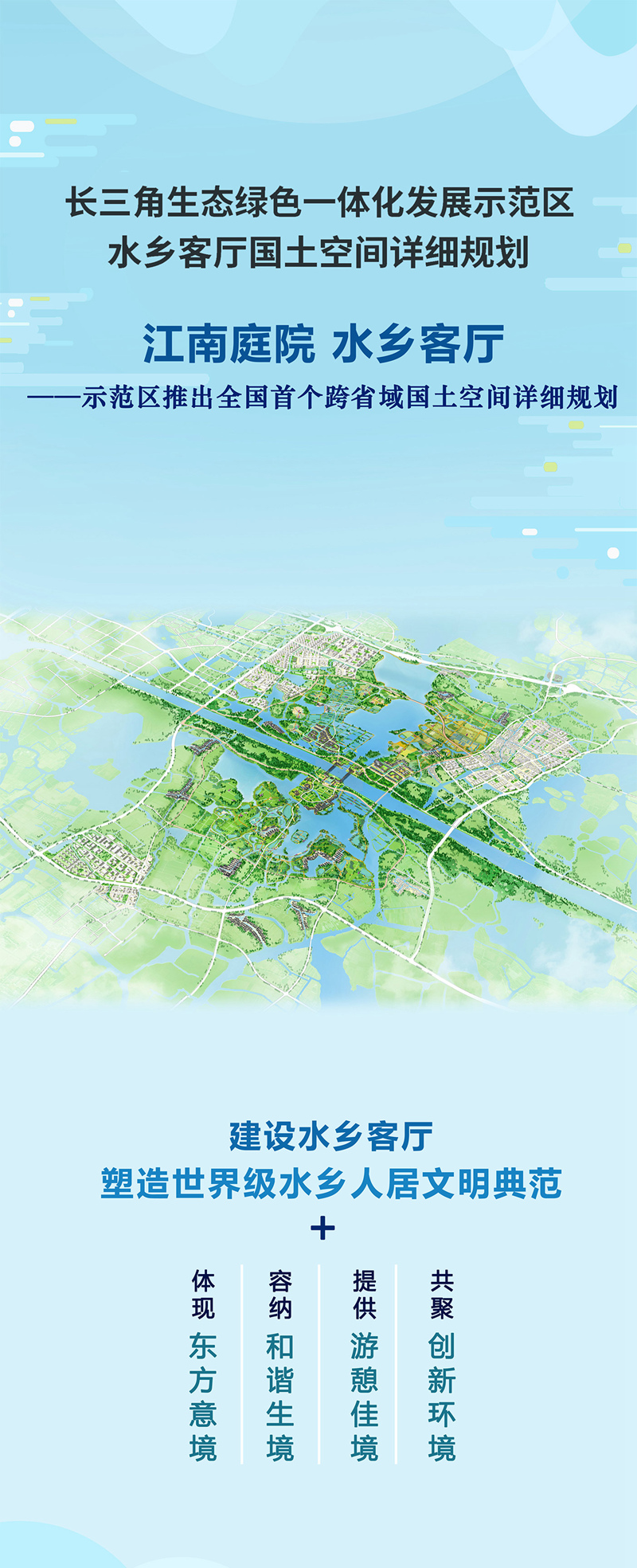 5月24日上午,在上海舉行了長三角一體化示范區(qū)水鄉(xiāng)客廳國土空間詳細(xì)規(guī)劃新聞發(fā)布會,會上發(fā)布了《長三角生態(tài)綠色一體化發(fā)展示范區(qū)水鄉(xiāng)客廳國土空間詳細(xì)規(guī)劃(2021-2035年)》,這也是全國首個跨省域的國土空間詳細(xì)規(guī)劃。水鄉(xiāng)客廳國土空間詳細(xì)規(guī)劃共13章、45節(jié),并包含了42張圖集以及詳細(xì)圖則,未來示范區(qū)將如何建設(shè)水鄉(xiāng)客廳?一圖詳解