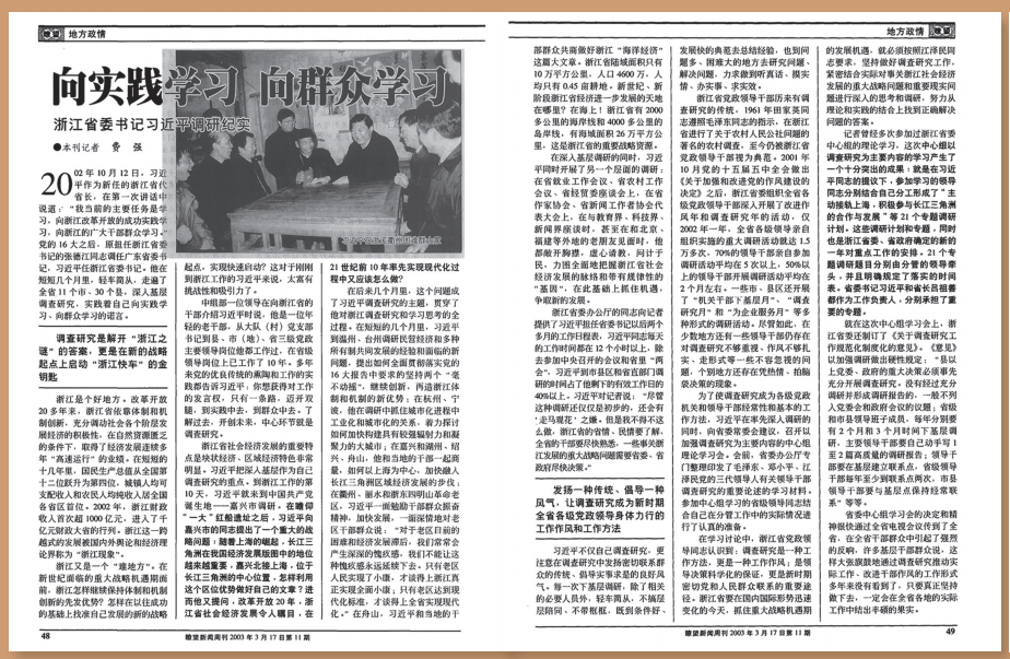 2003年3月,第10期、第11期《瞭望》連續(xù)刊發(fā)費強采寫的深度報道《浙江省委書記習(xí)近平:雙輪驅(qū)動提速發(fā)展》《向?qū)嵺`學(xué)習(xí)?向群眾學(xué)習(xí)——浙江省委書記習(xí)近平調(diào)研紀實》。4個月后,浙江省委十一屆四次全會提出了面向未來要進一步發(fā)揮八個方面的優(yōu)勢、推進八個方面的舉措,即“八八戰(zhàn)略”。其中的諸多提法,在《瞭望》的上述報道中已現(xiàn)雛形。
