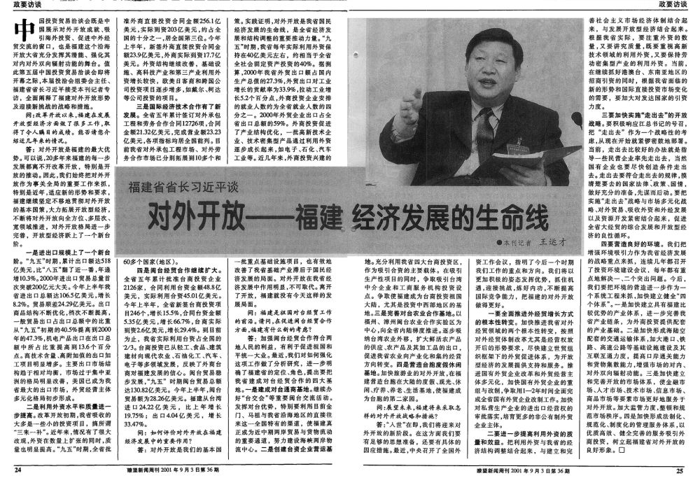 這篇專訪《福建省省長習(xí)近平談:對外開放——福建經(jīng)濟發(fā)展的生命線》,在《瞭望》2001年第36期刊發(fā)后,被臺灣媒體廣泛轉(zhuǎn)載,在廣大臺灣同胞中引起了強烈的共鳴。