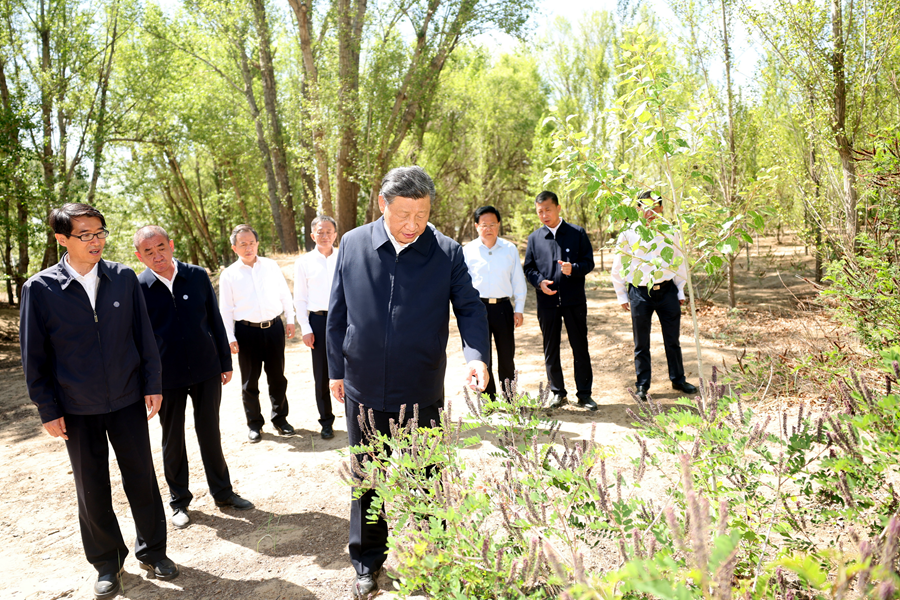 2023年6月5日至6日,中共中央總書記、國家主席、中央軍委主席習近平在內(nèi)蒙古巴彥淖爾考察,并主持召開加強荒漠化綜合防治和推進“三北”等重點生態(tài)工程建設座談會。這是5日下午,習近平在烏梁素??疾?。新華社記者 謝環(huán)馳 攝