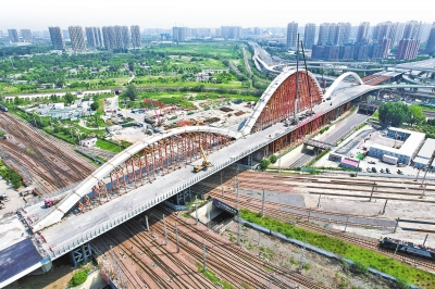 (圖/本報記者 王錚 攝) ??7月18日,隨著合龍指令的發(fā)出,鄭州新建彩虹橋主橋中跨最后一節(jié)鋼箱拱緩緩放落,橋梁的“彩虹”輪廓初現(xiàn)芳容。 ??“這節(jié)鋼箱拱長8.4米、寬8米、高2米?!背薪ǚ街需F大橋局彩虹橋項目相關(guān)負(fù)責(zé)人表示,至此,新建彩虹橋的鋼箱拱全部安裝完畢,標(biāo)志著大橋主體結(jié)構(gòu)即將完工,為實現(xiàn)按期通車目標(biāo)奠定了堅實基礎(chǔ)。 ??被稱為“彩虹橋”的鄭州北環(huán)快速路鐵路跨線大橋,是鄭州北區(qū)東西向的咽喉要道,1994年年底建成通車,由于近年來交通量逐年增大,橋梁通行壓力較大,該橋經(jīng)過多次整修仍無法滿足市民出行需求,2019年拆除重建。 ??據(jù)介紹,鄭州新建彩虹橋上部結(jié)構(gòu)為下承式三跨連續(xù)單拱肋鋼箱系桿拱橋,重2000多噸。預(yù)計新橋建成后,將大大緩解北三環(huán)東西向的交通壓力,對于完善鄭州的快速路網(wǎng)結(jié)構(gòu),加強(qiáng)中心城區(qū)與周邊區(qū)域的聯(lián)系等具有重要意義。(記者 李林)
