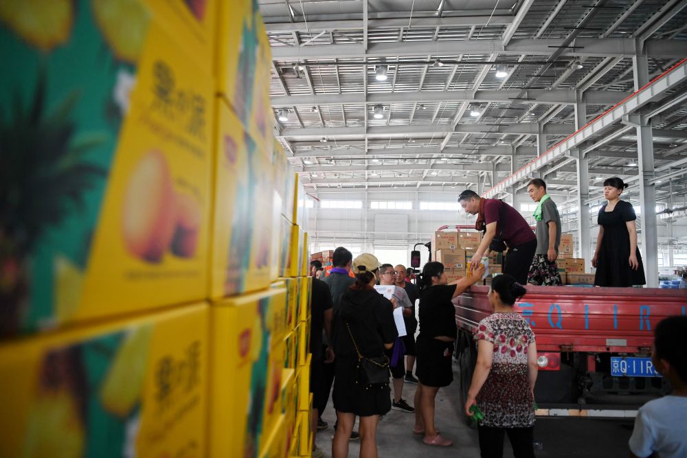 工作人員和志愿者在河北省涿州市鋼研物資儲備點內(nèi)將捐贈物資裝車外運(8月5日攝)。新華社記者 牟宇 攝