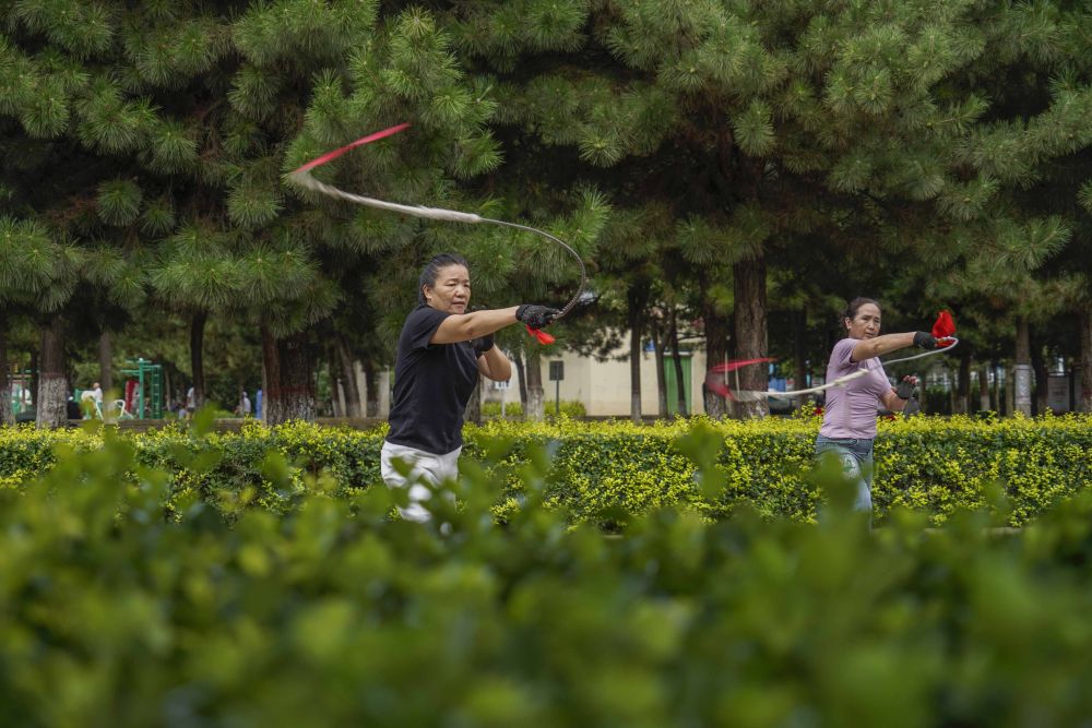 2023年8月6日,市民在河北省遵化市人民公園練習(xí)健身鞭。新華社發(fā)(劉滿倉攝)