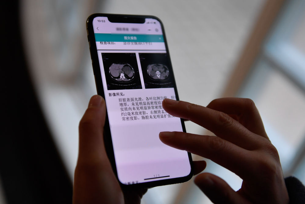 2021年1月20日,在杭州市余杭區(qū)第一人民醫(yī)院,居民通過手機使用“健康余杭智慧云共享平臺”查看檢查圖文報告。新華社記者 黃宗治 攝