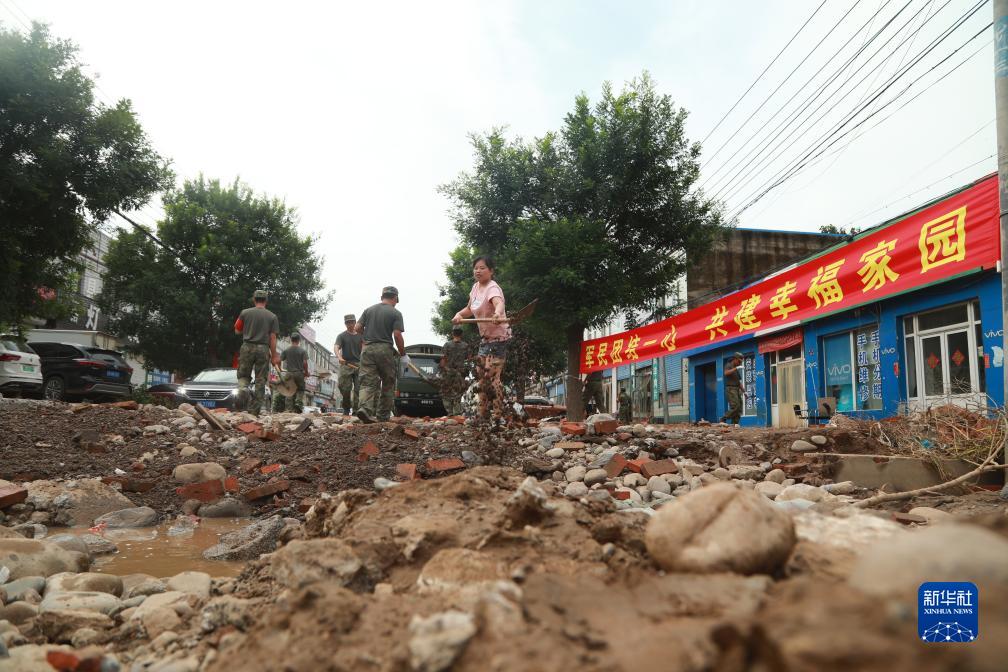 8月7日,武警河北總隊機動支隊官兵在涿州朝陽大街搬運垃圾、清淤清泥、沖洗街道。新華社發(fā) (趙佳亮 攝)