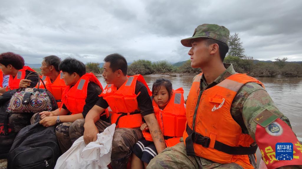 8月7日,陸軍第78集團軍某旅組織官兵在黑龍江五常市沙河子鎮(zhèn)使用沖鋒舟轉(zhuǎn)移受困群眾。新華社發(fā) (王麒淞 攝)