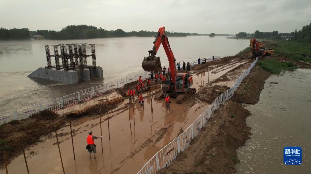 陸軍第82集團軍某勤務(wù)旅官兵在河北涿州市東茨村大橋進行巡堤筑壩任務(wù)(8月2日攝)。新華社發(fā)(鄧青華 攝)