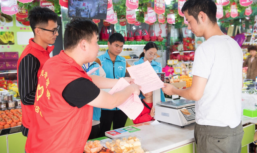 浙江省湖州市吳興區(qū)八里店鎮(zhèn)結(jié)合主題教育和“三服務”,推進“民生大走訪”工作機制,全體網(wǎng)格員下沉村、社一線,了解社情民意,化解矛盾糾紛,服務村社群眾。這是八里店鎮(zhèn)中心片區(qū)網(wǎng)格員(藍衣者)和志愿者(紅衣者)對一家店鋪進行平安問卷調(diào)查(2019年10月31日攝)。新華社記者 翁忻旸 攝