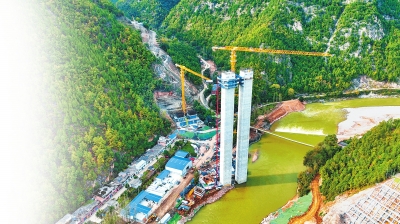 10月9日,在位于盧氏縣徐家灣鄉(xiāng)鳳凰灣村的盧氏至洛南(豫陜省界)高速公路良木村洛河特大橋施工現(xiàn)場(chǎng),一根根百米高墩拔地而起,在山巒間筑起了一道結(jié)實(shí)宏偉的“墩林”。
